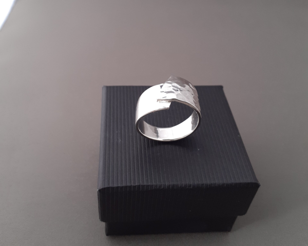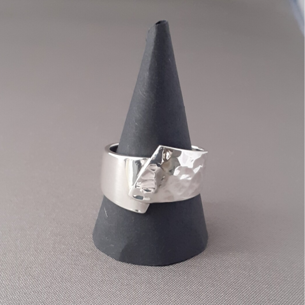 Dit is een door mijzelf handgemaakte zilveren ring met een putjes hamerslag structuur.