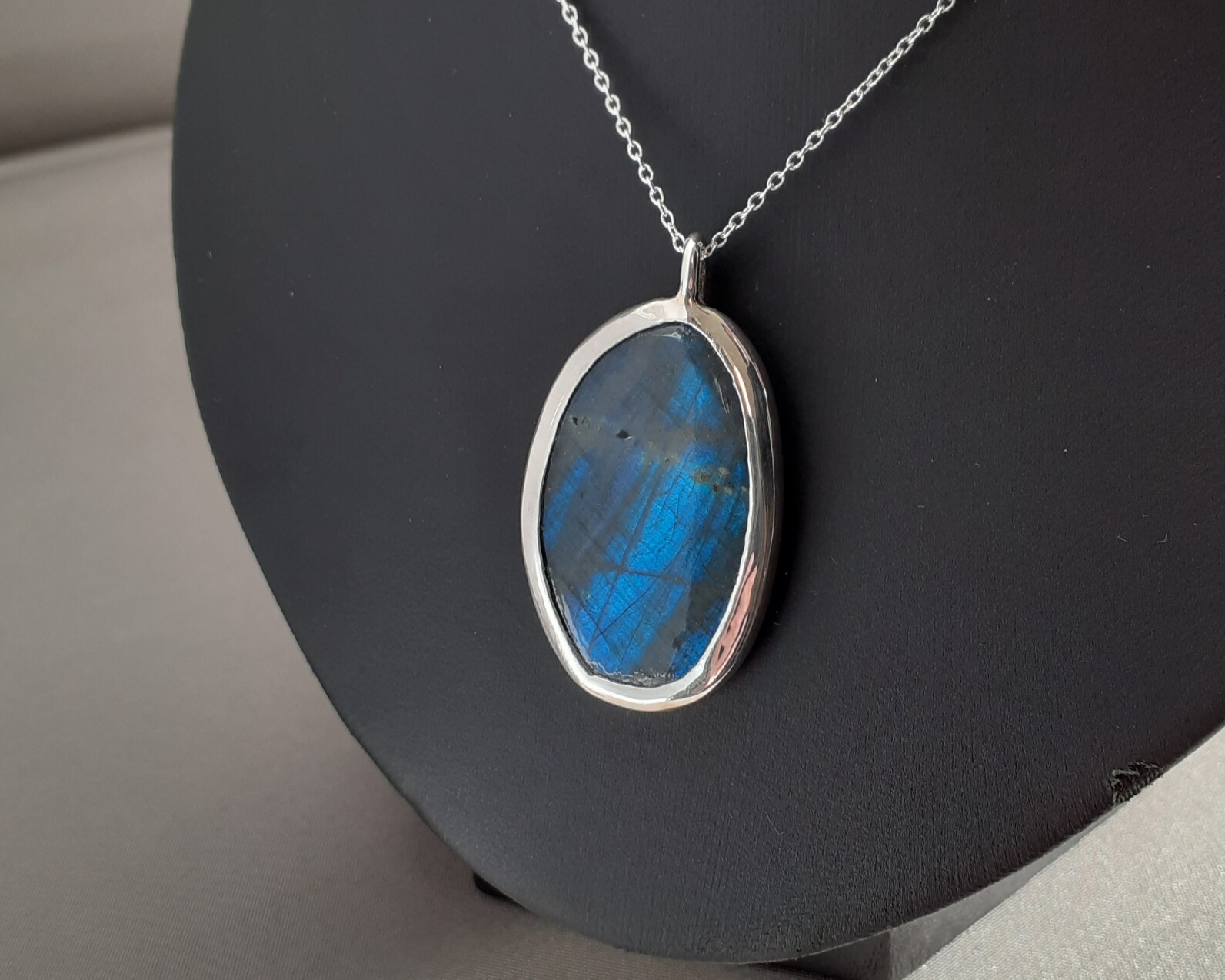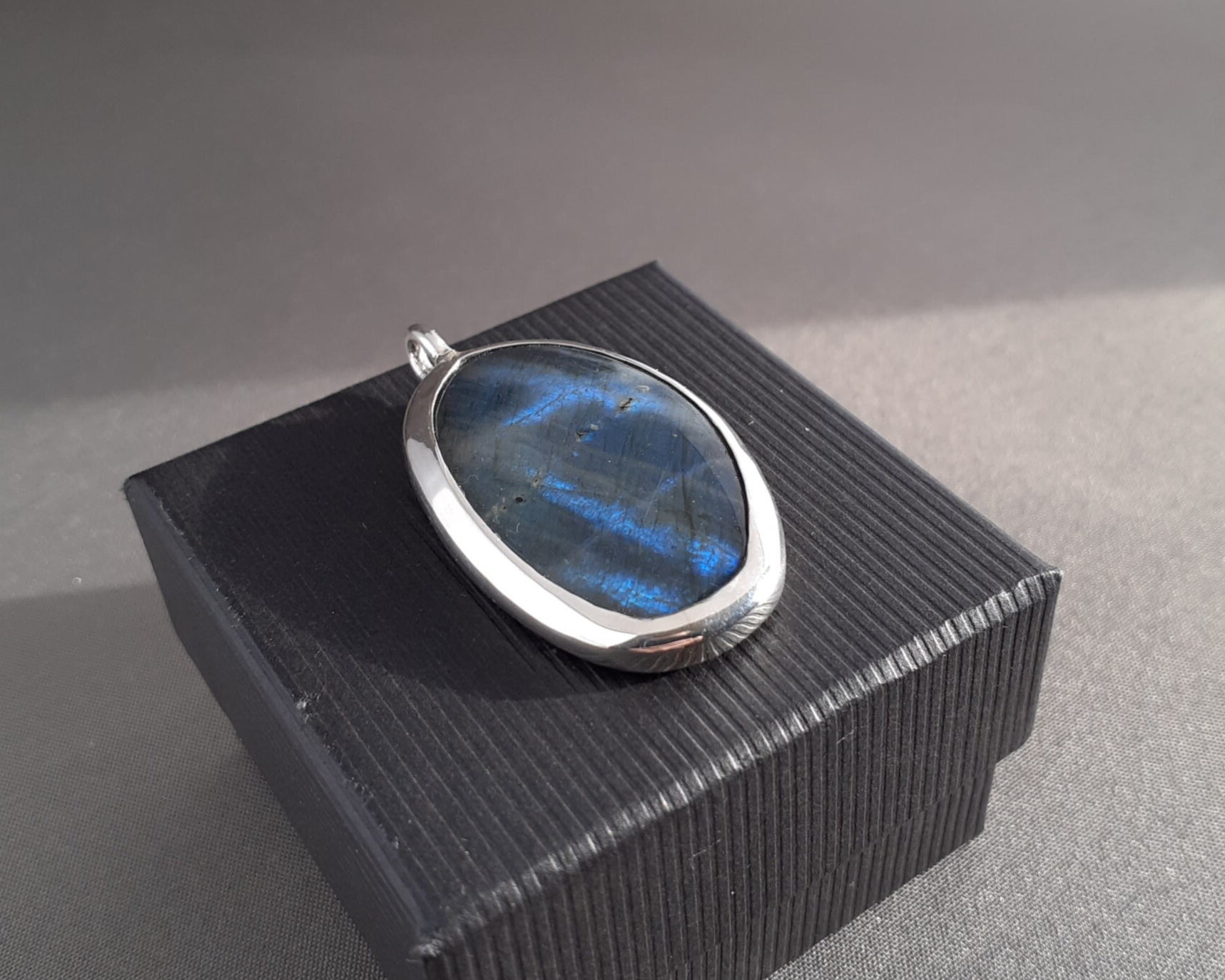 Dit is een handgemaakte hanger, waarbij de Spectroliet aan allebei de kanten kan worden gedragen.